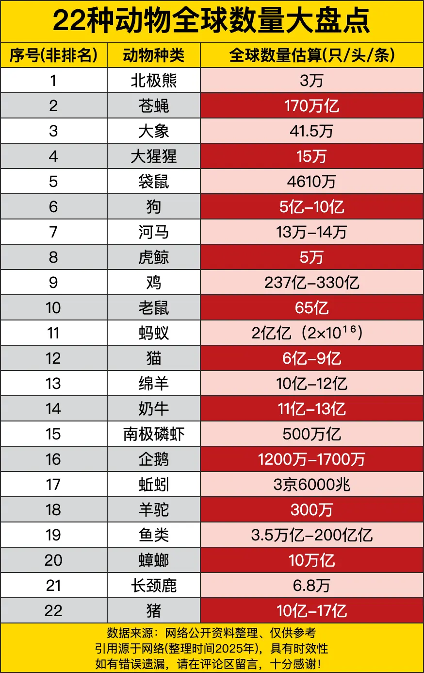 22种动物全球数量大盘点,鸡有两三百亿只,猪不到20亿只